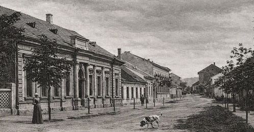 Ulica smerom na námestie. Dnes je to pešia zóna - Obchodná ulica. Vpravo je sokolovňa, vľavo býval MUDr. Adda Viktor, dnes tam stojí komplex "365".