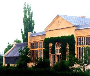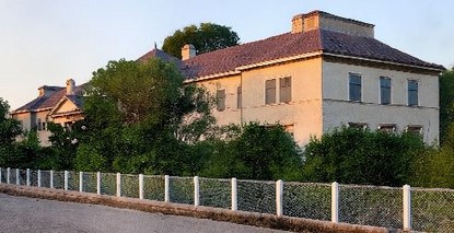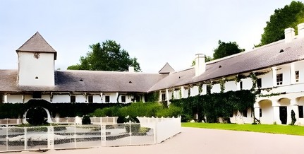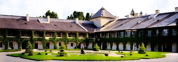 Nádvorie kaštieľa v Nagybodok. Pohľad na juhovýchod. Kaštieľ s fontánou a zeleňou okolo nej. Celá budova kaštieľa bola obrastená popínavým brečtanom.