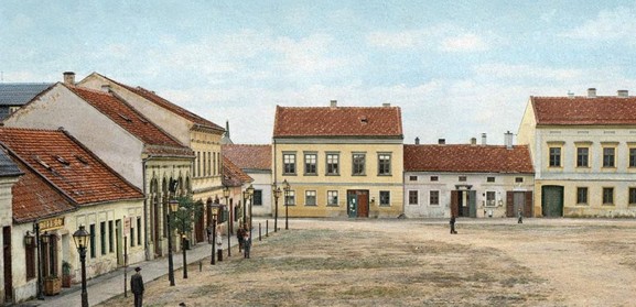 Zelenkasté odtiene na historickej snímke naznačujú, že povrch námestia bol tvorený udupanou zeminou, okrem chodníkov pred budovami okolo námestia. V strede vidíme súsošie Najsvätejšej trojice (trojičný stĺp) z roku 1768. Vľavo na snímke stojí budova fary a ďalej vedľa nej vtedajšia prízemná budova mestského domu, ktorá slúžila od roku 1868 na účely mestskej samosprávy. Súčasná reprezentačná secesná budova radnice bola postavená až v roku 1911.