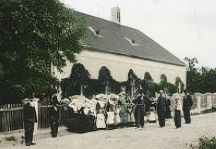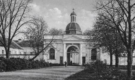 Fotografia datovaná do roku 1907. Architektúra zadnej brány je podobná hlavnej bráne. Vpravo, v pozadí, sa belie silueta Kostola sv. Michala Archaniela v Závade.
