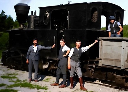Starší Topoľčanci - a nielen tí z Topoľčian - určite spoznajú túto budovu s nápisom NAGY - TAPOLCSÁNY. Ide o železničnú stanicu z čias, keď sme boli súčasťou Rakúsko-Uhorska. Na obrázku ešte nie je prekrytie nástupišťa. Parná lokomotíva pokojne dymí a zamestnanci železníc spolu s deťmi (možno prednostu stanice) pózujú pred objektívom fotografa. Vpravo si možno všimnúť bicykel - podobné retro modely sú dnes opäť v móde, najmä medzi dámami - okolo zadného kolesa bývala ochranná sieťka, ktorá chránila sukňu pred ušpinením či nešťastným zachytením do výpletu kolesa. Nezasiahla vás niekedy túžba po stratenej kráse a účele starých čias?