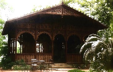 Juho-západné krídlo kaštieľa s nárožnou vežou aj s priľahlým parkom v Tavarnoku. Za stromami v popredí bol dole altánok švajčiarskeho štýlu, ktorý slúžil na tancovanie, spievanie, činoherné predstavenia, rozhovory...