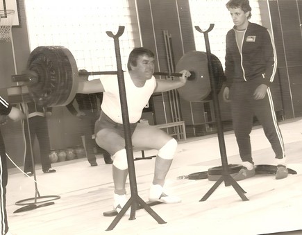 M-Zsl. kraja 1979 v silovom trojboji. Bystrík Káčer pri úspešnom pokuse v drepe. Vzadu mu asistuje popredný čs. kulturista Michal Kolarovič z V. Kostolian.